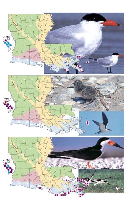 | . . . . . . . . . . . . | Sterna caspia    Caspian Tern In Louisiana, these ground-nesting piscivores breed strictly along the coast. The "Possible" records probably represent birds that have commuted some distance from their breeding colonies to feed. photo Copyright © 1999 by Brian Miller  |