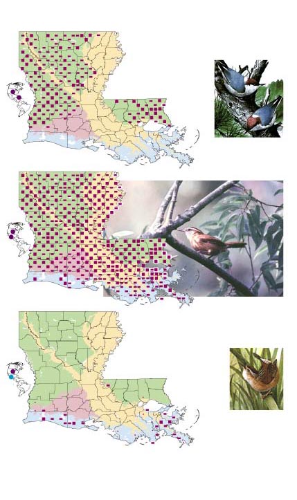 | . . . . . . . . . . . . | Thryothorus ludovicianus Carolina Wren These urban-tolerant and cavity-nesting insectivores thrive in virtually all wooded areas of the state, including pine plantations. Carolina Wrens are nearly as common as the Louisiana's most abundant bird, the Northern Cardinal. photo Copyright © 1999 by Dan Lane |